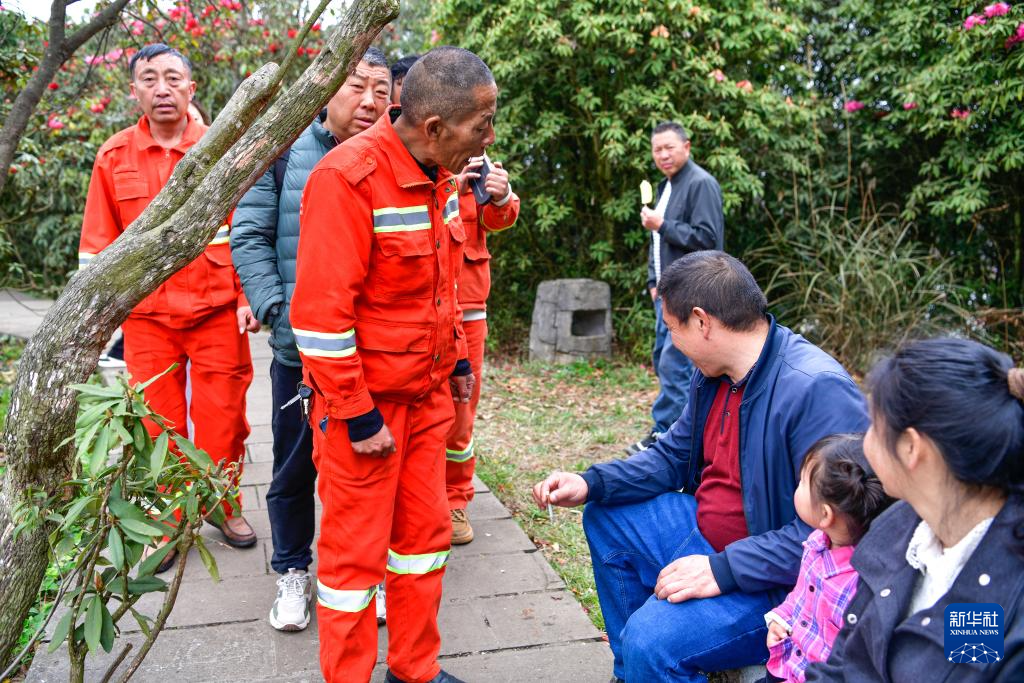 森林防火队员们在贵州百里杜鹃管理区金坡景区巡逻途中休息(4月2日摄)。