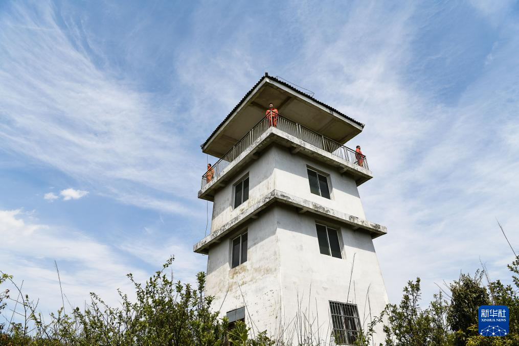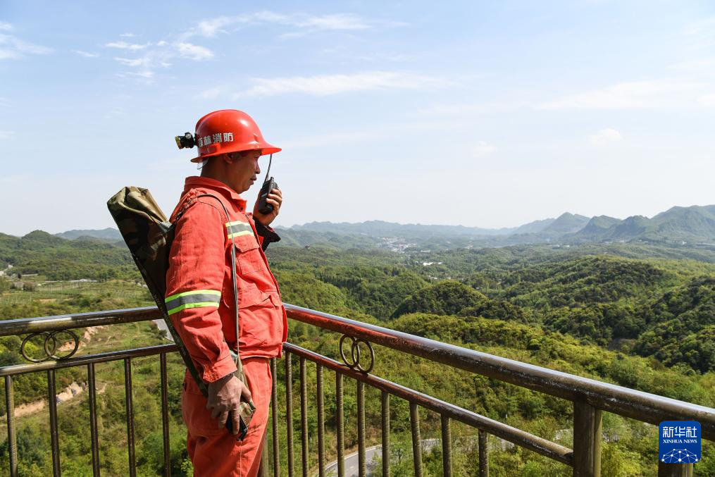 森林防火队员在贵州百里杜鹃管理区金坡景区的一处瞭望塔上查看林区情况(2020年4月28日摄)。