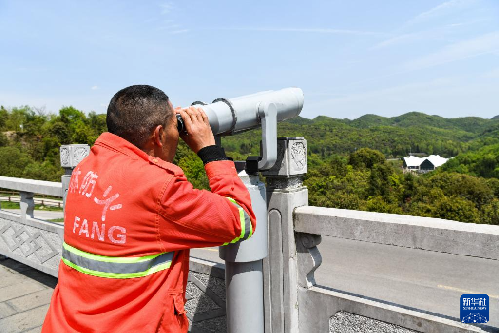 森林防火队员在贵州百里杜鹃管理区金坡景区利用望远镜查看林区情况(2020年4月28日摄)。