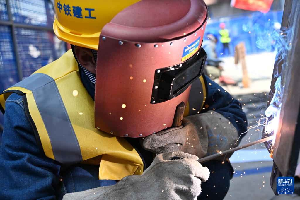 4月8日,在青岛市南京路1号项目比赛现场,选手参加电焊工个人赛。