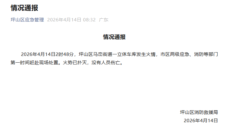 中新网4月14日电据“坪山区应急管理”微信公众号消息,4月14日,深圳坪山区消防救援局发布情况通报称,4月14日2时48分,坪山区马峦街道一立体车库发生火情,市区两级应急、消防等部门第一时间赶赴现场处置。火势已扑灭,没有人员伤亡。