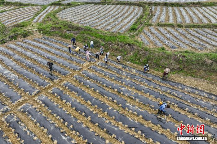 4月15日,贵州省贵定县德新镇,工人抢抓农时在丰收村辣椒种植基地移栽辣椒苗,田间地头一派繁忙景象。据悉,德新将辣椒作为助农增收的重要产业,积极引导种植大户带动民众参与,推动辣椒种植向规模化、标准化发展。丰收村基地种植辣椒200余亩,其中100余亩由大户带动民众种植。(无人机照片)中新社记者瞿宏伦 摄