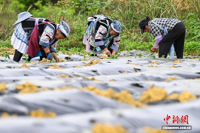 4月15日,贵州省贵定县德新镇,工人抢抓农时在丰收村辣椒种植基地移栽辣椒苗,田间地头一派繁忙景象。据悉,德新将辣椒作为助农增收的重要产业,积极引导种植大户带动民众参与,推动辣椒种植向规模化、标准化发展。丰收村基地种植辣椒200余亩,其中100余亩由大户带动民众种植。中新社记者瞿宏伦 摄