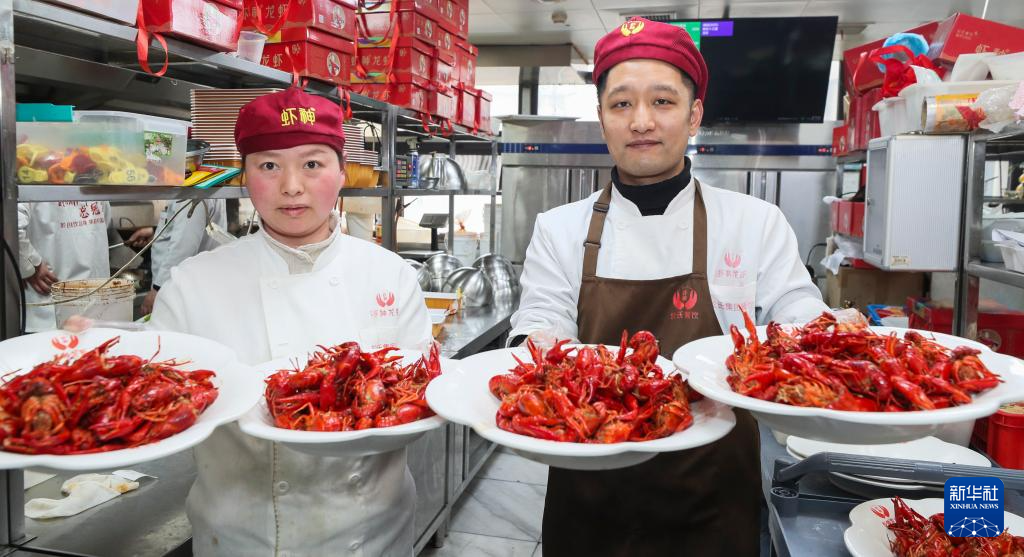 3月19日,在江苏省盱眙县,厨师展示新鲜上市的小龙虾。