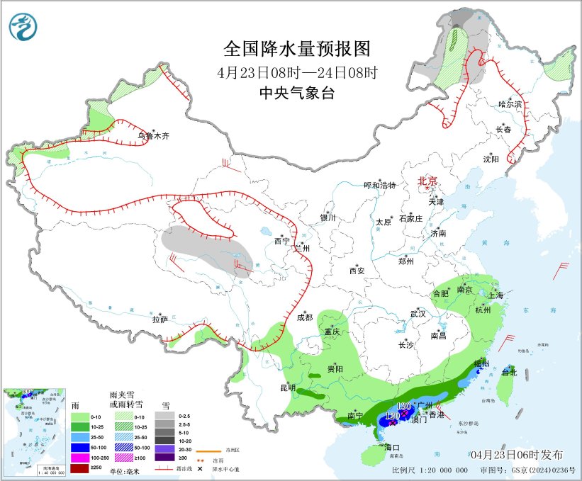 4月23日08时至24日08时,内蒙古东北部、黑龙江北部、新疆北疆北部和南疆西部山区、青海南部等地部分地区有小雪或雨夹雪,其中,内蒙古东北部、黑龙江西北部等地部分地区有中到大雪;福建东南部、广东中南部、广西东南部、台湾岛北部等地部分地区有中到大雨,其中,福建东南部、广东西南部等地部分地区有暴雨或大暴雨(100~130毫米)。青海中西部、甘肃河西、川西高原北部等地部分地区有4~6级风。