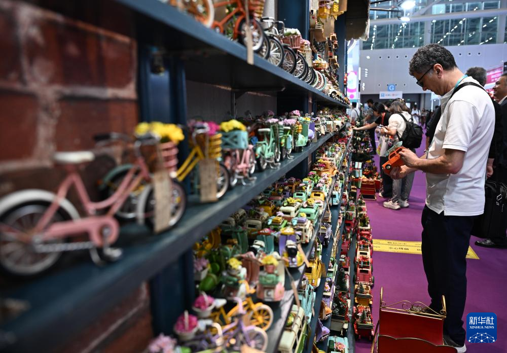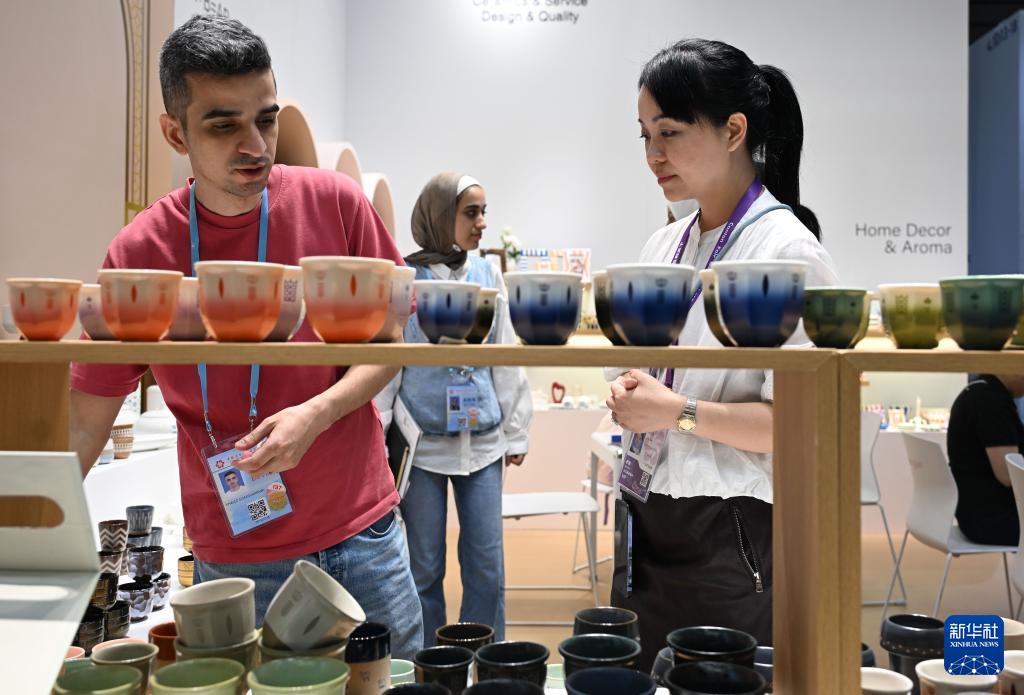 4月23日,境外采购商(右)在第139届广交会第二期的装饰品展台参观。