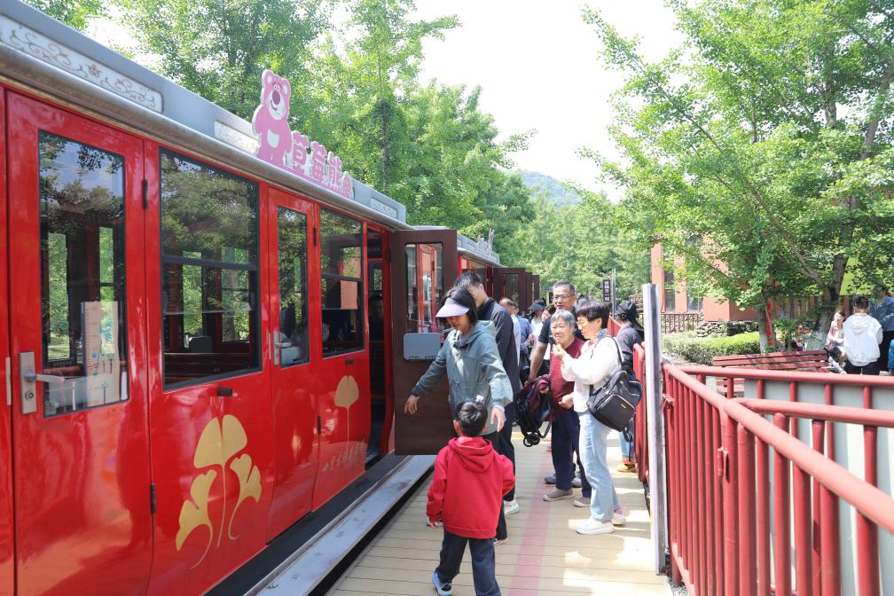 今年4月25日,湖州市长兴县小浦镇八都岕景区内,游客有序登上“杏福小火车”,游览春日银杏林。(长兴县委宣传部供图)