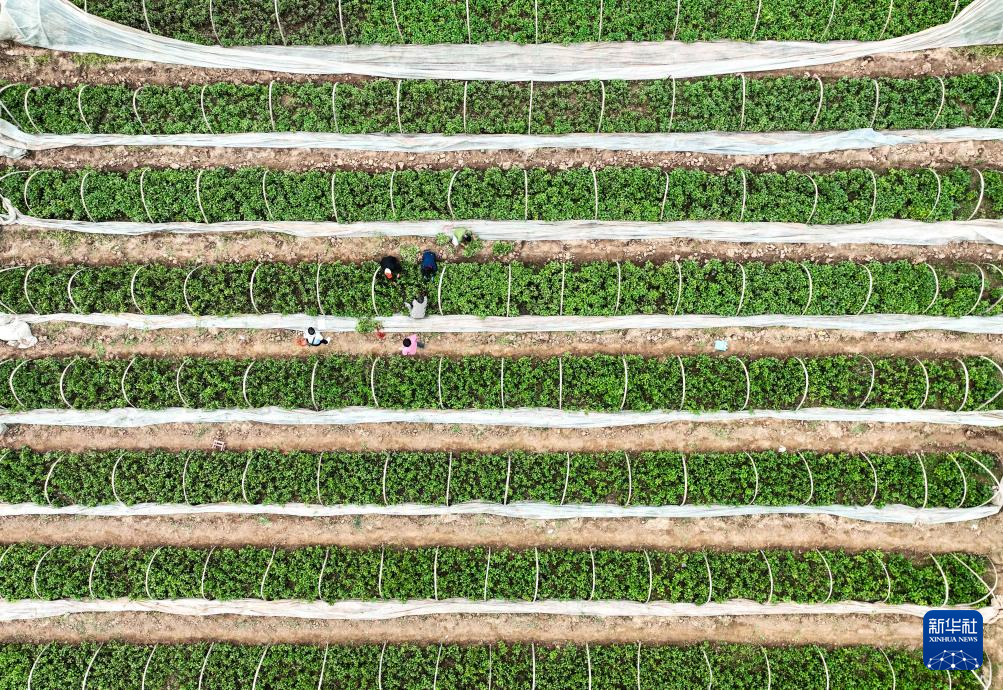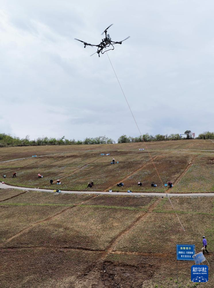4月26日,农民们在湖北省宣恩县珠山镇一处花圃基地里劳作,无人机在运送肥料、苗木等生产物资(无人机照片)。