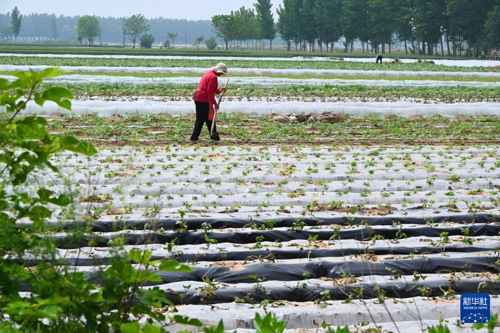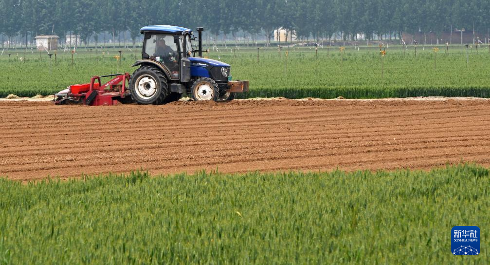 4月28日,河北省遵化市东新庄镇农民在麦田里忙碌。