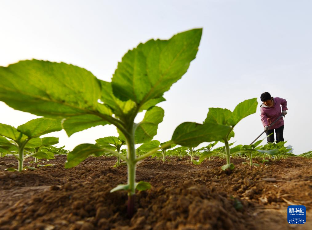 4月27日,农民在河北省石家庄市栾城区西营乡一处向日葵田里劳作。