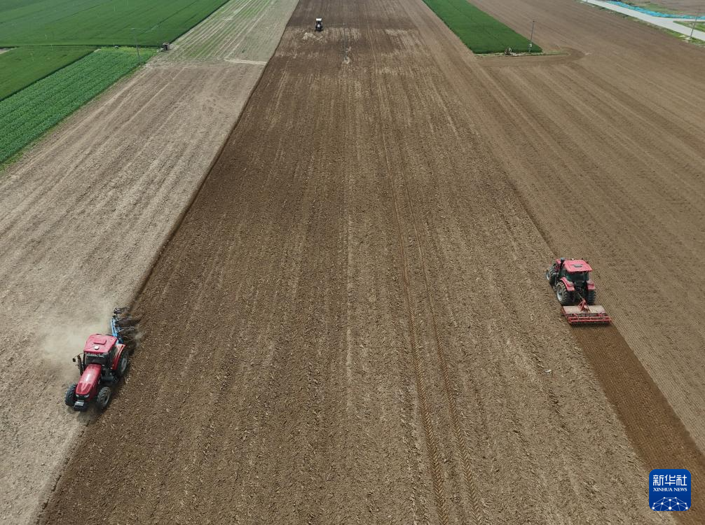4月27日,河南省焦作市温县黄河街道东张王庄村农民驾驶农机在翻耕土地,准备种植花生(无人机照片)。