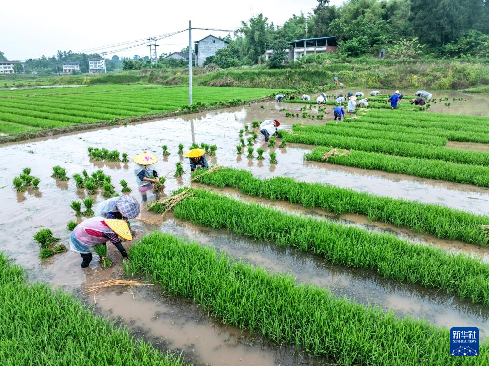4月26日,四川省广安市广安区白市镇月光村村民冒雨在稻田内起秧(无人机照片)。