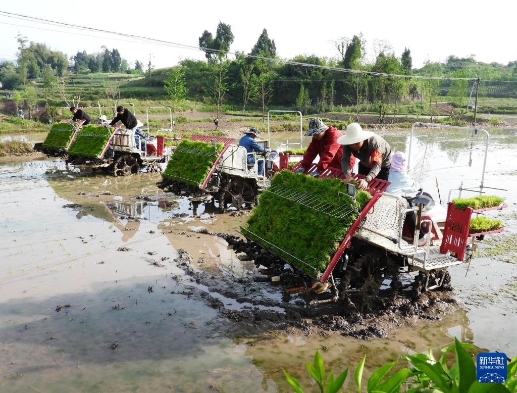 4月25日,在四川省达州市达川区南岳镇九元村,党员志愿者和农民操作搭载北斗卫星导航系统的插秧机插秧。