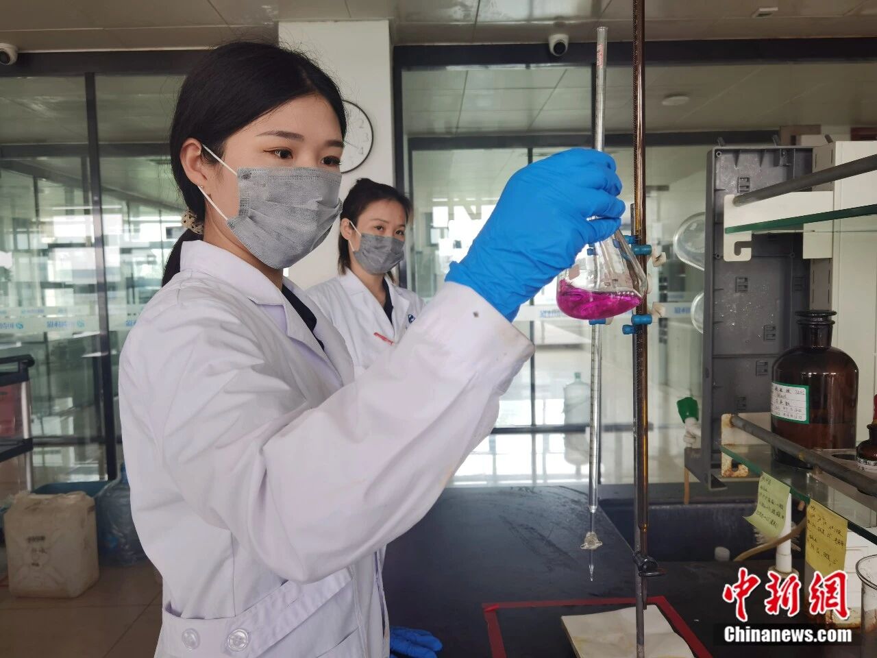 2022年8月18日,在河北省邯郸市永年区的恒创环保科技高端标准件产业园,工作人员正在抽样检测化学原料。胡高雷 摄