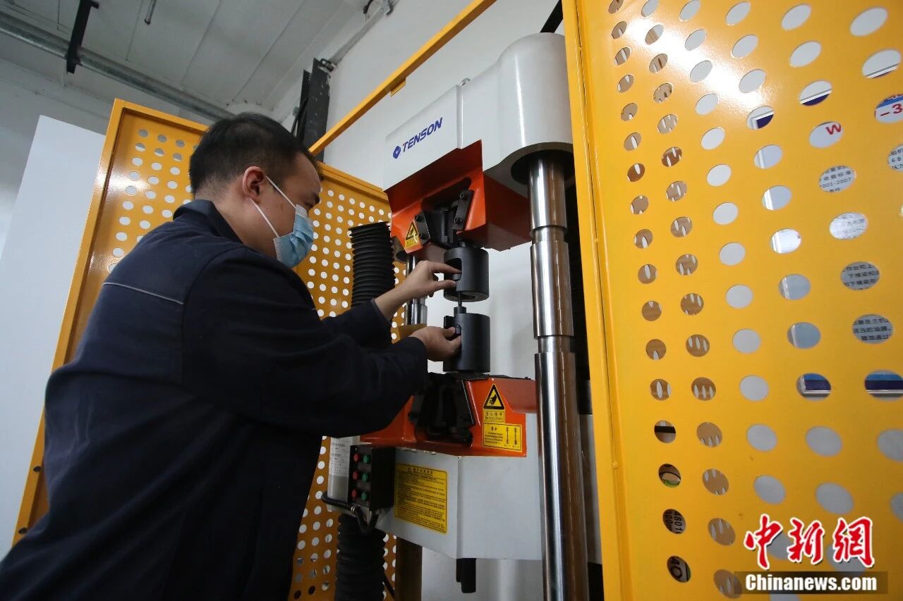 2022年11月8日,工作人员在位于邯郸市永年区的河北省紧固件产业技术研究院实验室内对紧固件进行强度拉伸测试。胡高雷摄