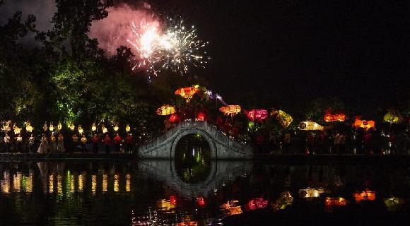 10月5日,花灯表演队伍在安徽省黄山市黟县宏村巡游。新华社发(樊成柱摄)