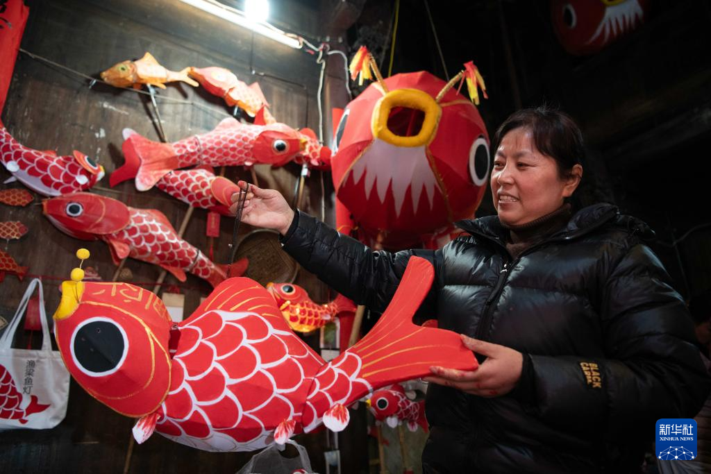 2月28日,在安徽省黄山市歙县徽城镇渔梁社区,渔梁鱼灯非遗传承人徐继丽在展示自己制作的鱼灯。