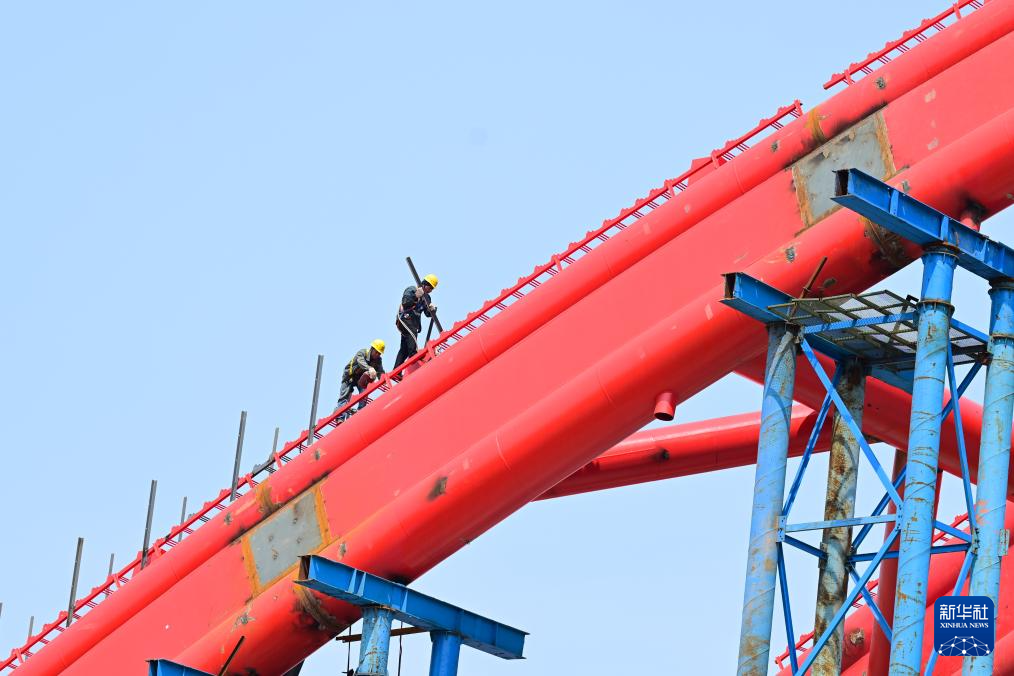 3月29日,中铁十一局工人在合武高铁安徽段金家寨路大桥128米系杆拱施工现场作业(无人机照片)。