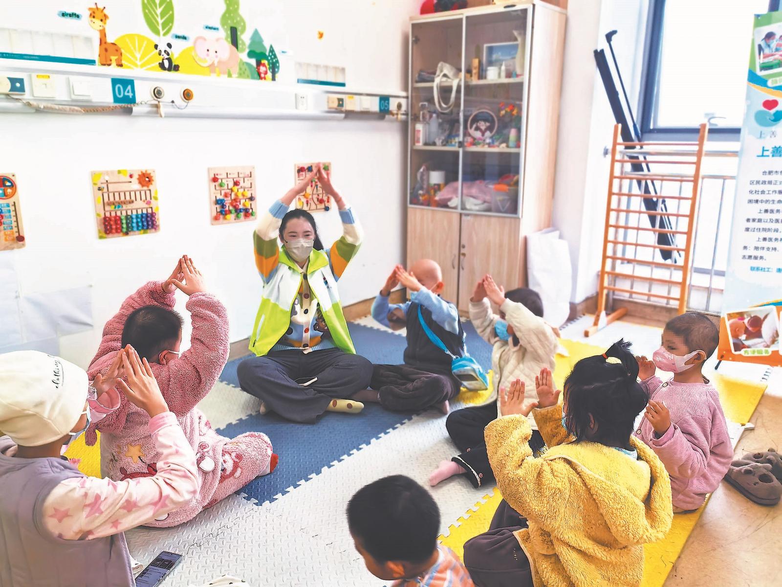 在安徽省肿瘤医院儿童血液与肿瘤科病房医务社工站,志愿者带孩子们开展活动。(资料照片)
