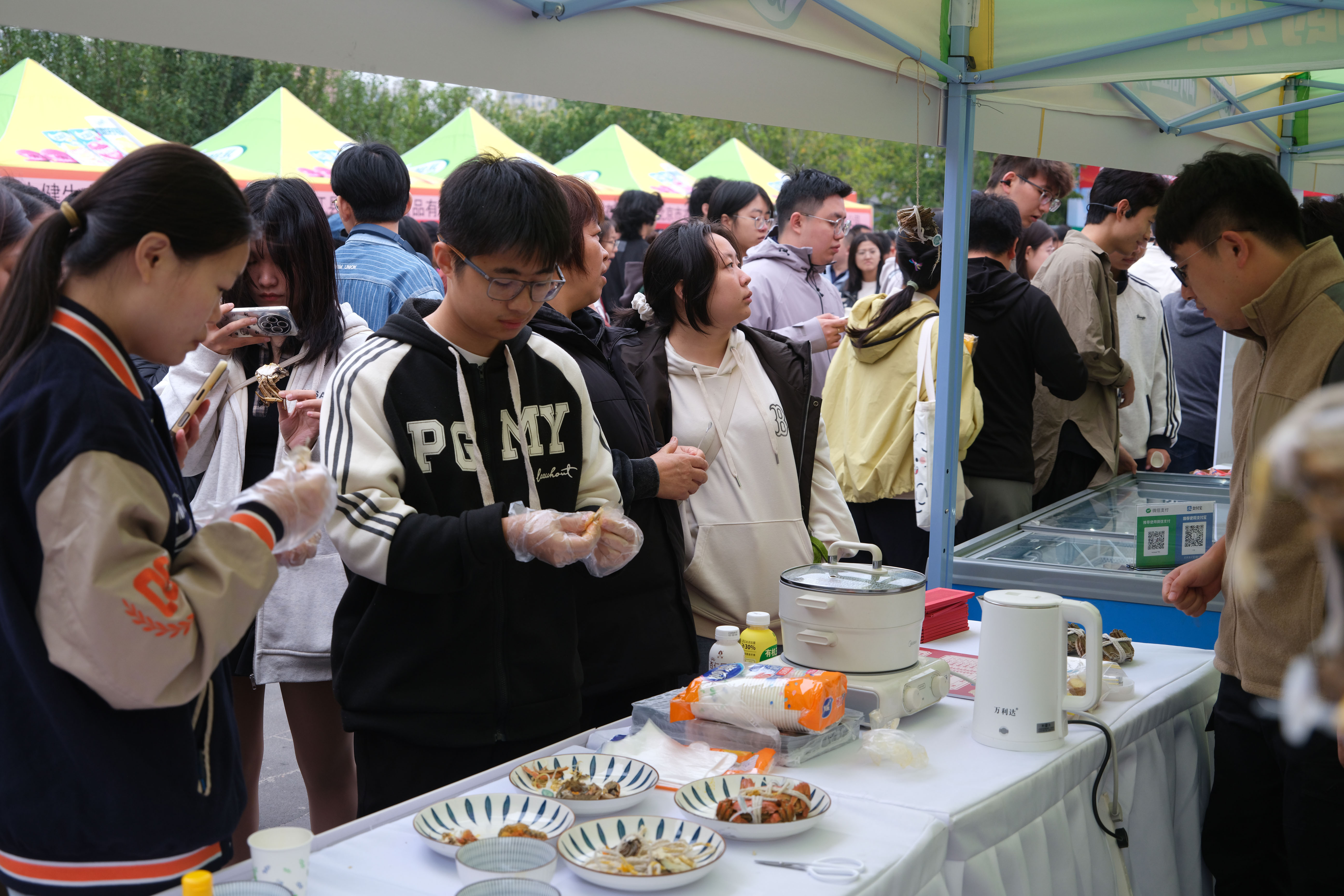图为同学们在农大首届校友食品文化节现场品尝特色食品。