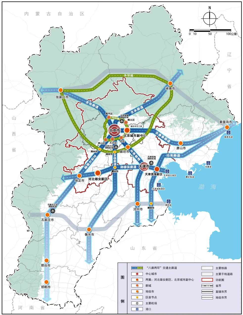 ——在交通领域,构建“八廊两环”交通主廊道,支撑首都都市圈内部空间格局优化。其中,内环线主要提升北京市域内交通连接效率,外环线疏解过境客货运交通,释放既有铁路资源为首都都市圈内通勤人群提供服务。加强海港、陆港、空港联动,提高区域物流运作效率。