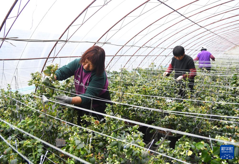 2月26日,在北京市平谷区山东庄镇鱼子山村一处设施农业基地的大棚内,工作人员管护蓝莓。