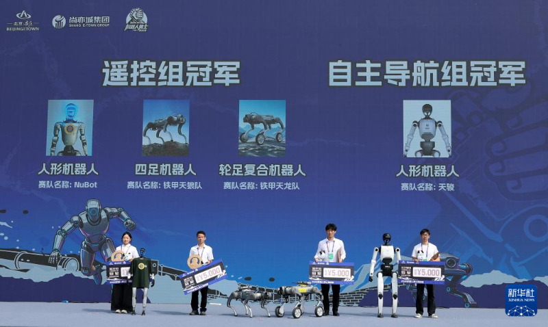 4月19日,机器人勇士挑战赛遥控组冠军和自主导航组冠军在颁奖仪式上合影。新华社记者 张晨霖 摄