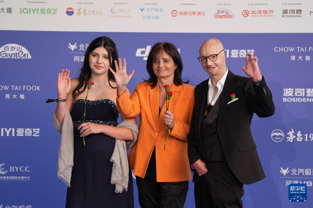 4月25日,电影《山火之后》导演特雷莎·维拉芙尔德(中),演员里卡多·维卡尔(右)、马达莱娜·库尼亚(左)亮相北京国际电影节闭幕式蓝毯现场。