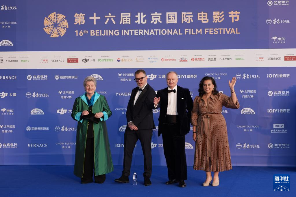 4月25日,电影《危情蜻蜓》导演保罗·安德森·威廉姆斯(左二),制片人玛丽-埃琳娜·戴奇(右一),演员布兰达·布莱斯(左一)、杰森·沃特金斯(右二)亮相北京国际电影节闭幕式蓝毯现场。