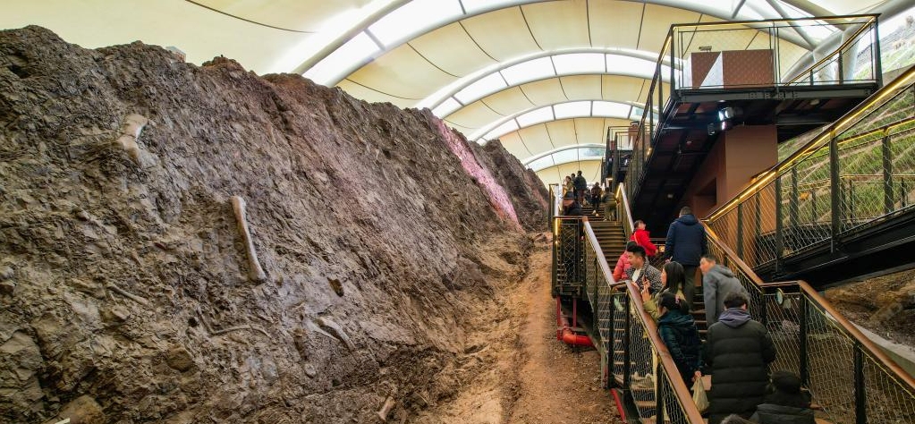 游客在云阳世界地质公园参观恐龙化石墙(1月30日摄,无人机照片)。新华社发