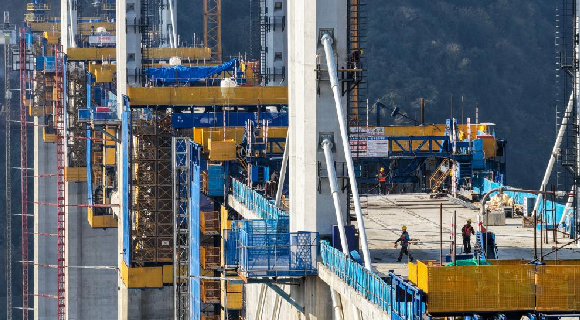 12月7日,工人在西渝高铁任河特大桥建设现场施工作业。