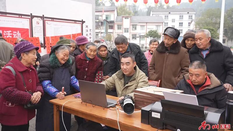 40分钟车程后,石墙镇广场院坝里已有村民等候。王海和赵志迅速搭起背景板、调试好打印机,上午8点40分,“百姓影棚”准时“开张”。