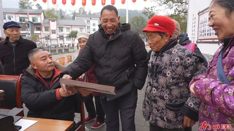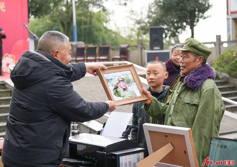 从清晨到正午,三个小时里,快门声在院坝中不时响起。赵志负责拍摄,王海则一边打印照片,一边将每一张照片装进事先准备好的精美相框。30份“影像礼包”被村民小心地揣在怀里、放进背篓,带着相纸的墨香踏上归途。