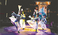 演出现场,巨幕LED让观众仿佛置身于《清明上河图》中。演出以宋代美学为基调,通过“春生、夏华、秋思、冬溯”四幕剧重现建州古城风貌。演出深度融合弓鱼技艺、建州酒令、北苑点茶等建瓯非遗,结合精心设计的服饰、舞蹈与多媒体互动,展现建州地域特色与节气流转之美。