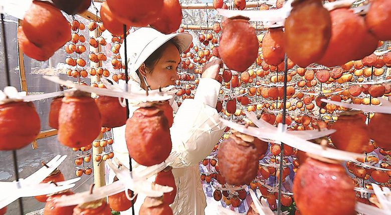 利洋村作为“炮弹柿”核心产区,近年来积极探索“共富联营”模式,通过镇、村、银、企、民“五维联动”,深耕特色,构建起全链条富民产业体系。图为在利洋村柿子园内,果农正忙着晾晒柿子。