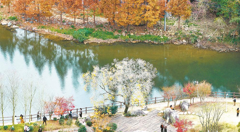 近日,在福州市晋安区九峰村,树叶染上斑斓色彩,与澄澈碧绿的湖水相映成趣,勾勒出如诗如画的冬日景致,引得游客拍照留念。