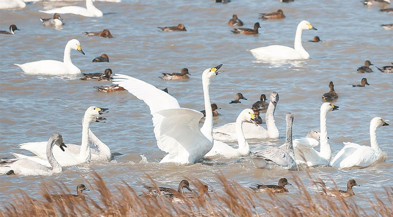 本报讯 (记者 张文奎 通讯员 黄欣 文/图)大雪时节已过,近日,闽江河口国家湿地公园上演壮丽的“鸟浪”景观,成群的小天鹅正优雅振翅,与多种候鸟在海潮中共舞,为冬日的湿地增添无限生机(如图)。