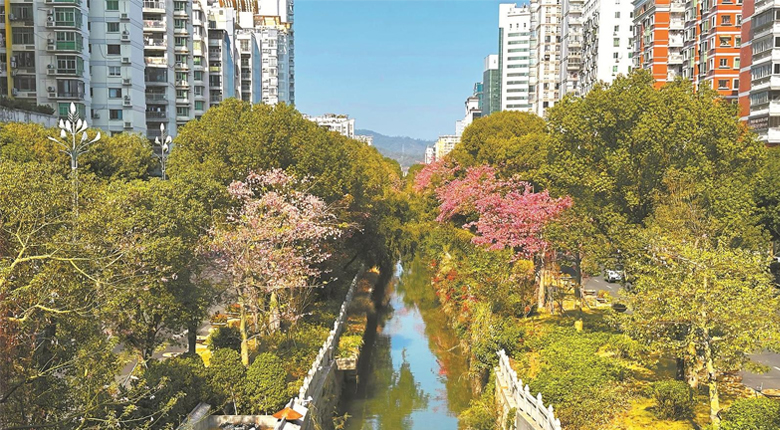 连日来天气晴好,从泉州市区刺桐路过街天桥上看去,内沟河两侧的绿树与红花倒映在水中,形成一派“水清、岸绿、河畅、景美”的生态宜居景象。