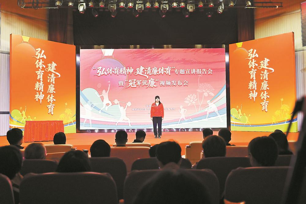 12月9日,福建省体育局会同驻局纪检监察组举办了“弘体育精神,建清廉体育”专题宣讲报告会暨“冠军说廉”视频发布会,彰显具有福建体育特色的廉洁文化建设成效,以“存正心、守正道、养正气”的理念赋能体育事业。
