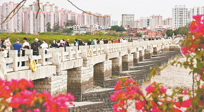 清明假期,世界遗产点洛阳桥游人如织。泉州市民游客漫步古桥,踏青赏景,感受世遗风韵。(融媒体记者彭燕珍 摄)
