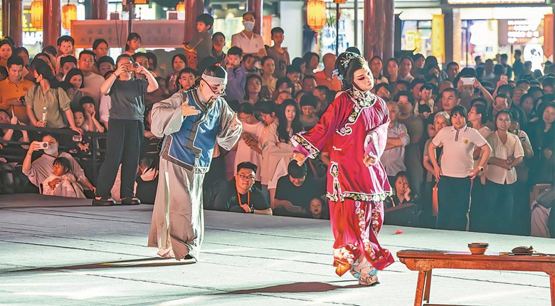 4月17日晚,2026年福建省文旅经济发展大会在漳州古城启幕。此次大会将持续至4月19日,通过策划6场主要活动和60场全省配套系列活动,为民众献上一场“提升文化影响力、展示福建新形象”的文旅盛会。图为漳州市歌仔戏(芗剧)传承保护中心的演员为市民游客表演传统剧目《讨学钱》。