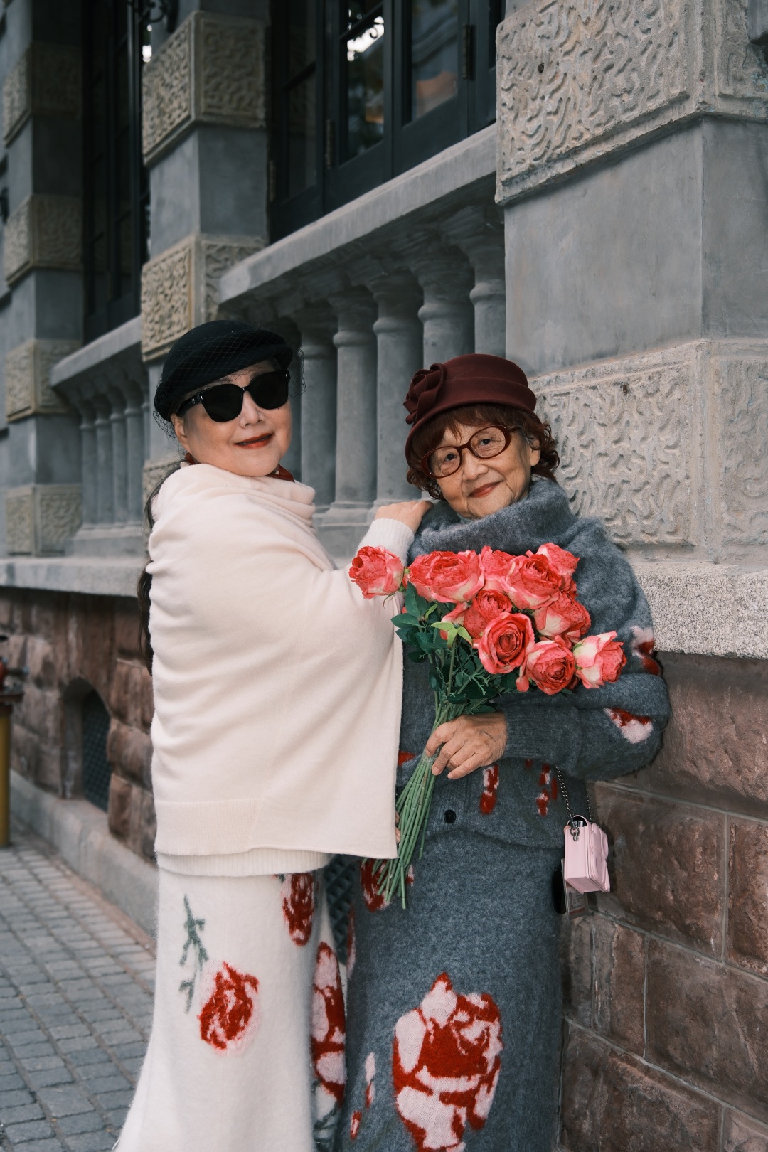 老人打扮得雅致又精神:枣红色绒面礼帽配同色系短卷发,红框眼镜衬得眉眼温和,脖颈间一朵明黄色针织玫瑰格外惹眼,粉色披肩与斜挎小包相得益彰。若不是凑近能看见眼角细纹,谁也想不到,这是一位刚做完肾囊肿手术不久的八旬老人。