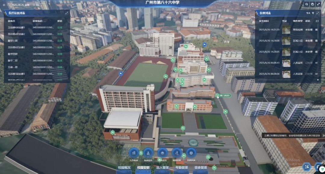 “校园出入口是人流最大的一个区域,通过系统对人员一个分类管理,可设置不同的进入权限,有效防止陌生人随意进入校园。还有之前巡逻是固定的时间地点,缺乏这个灵活性,难以应对动态的风险。如今借助这个系统能够精准识别高风险地点,使保安工作更聚焦于重点区域的巡逻。”广州市八十六中学校园安防负责人陈先生表示,“以前是用脚巡逻,现在是用心守护。”