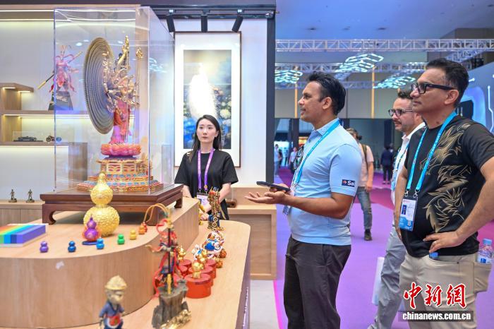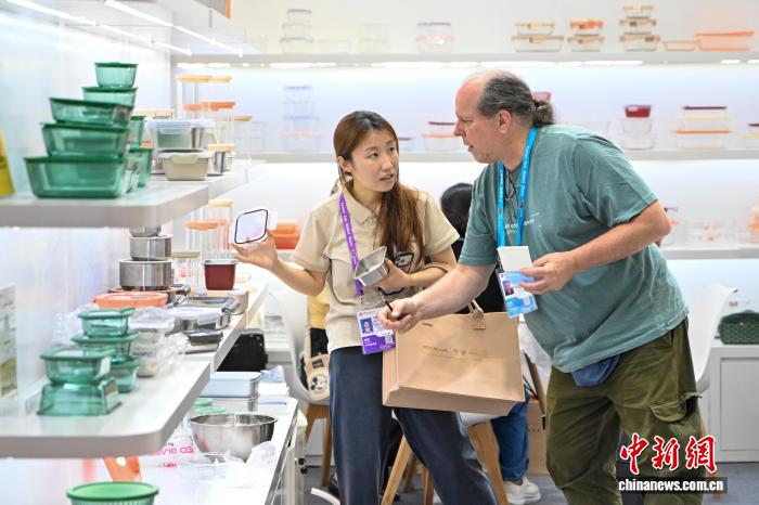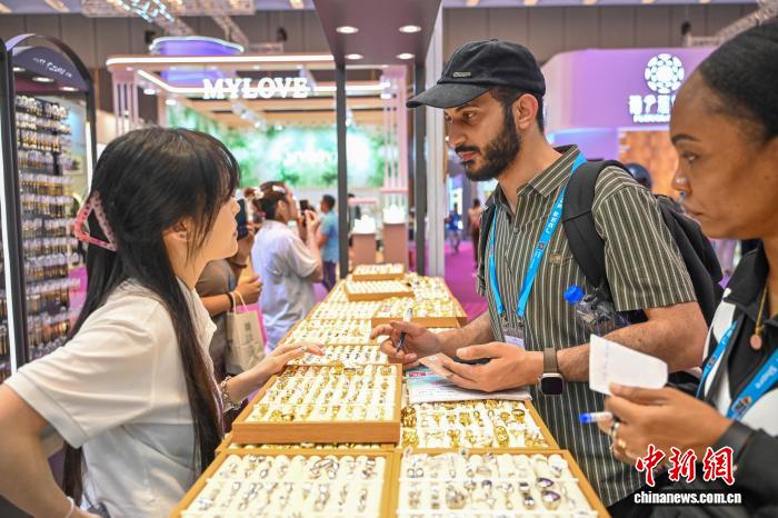 图为境外采购商在时尚饰品专区挑选产品。中新社记者 陈骥旻摄