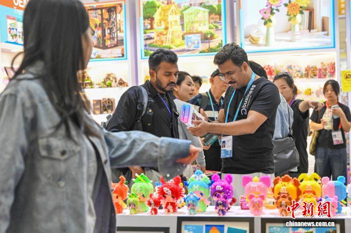 图为境外采购商在礼品及赠品展区挑选产品。中新社记者 陈骥旻摄