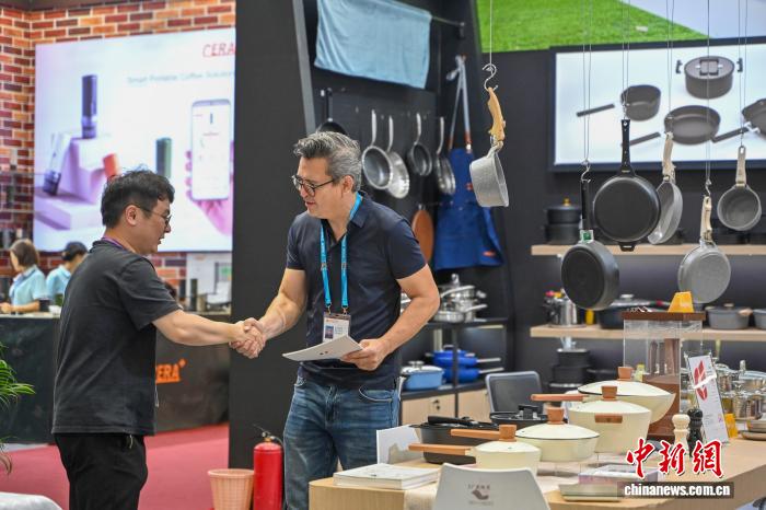 图为餐厨用具参展商(左)与境外采购商洽谈。中新社记者 陈骥旻摄