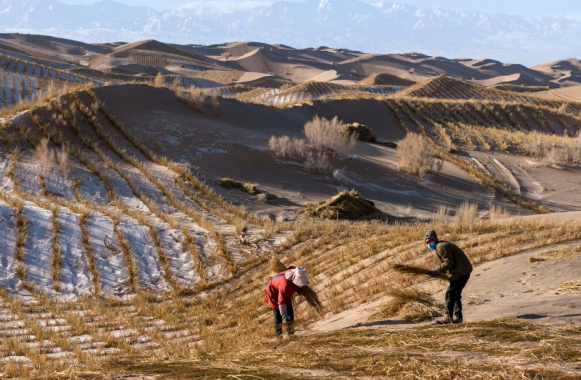 一场冬雪过后,在甘肃省酒泉市阿克塞哈萨克族自治县的库姆塔格沙漠边缘,施工人员忙着铺设沙障,有序推进甘肃省酒泉市祁连山北麓阿克塞片区水源涵养与生态保护修复项目。该项目总规模22.2万亩,包括工程固沙、封滩(沙)育林、人工造灌木林等防沙治沙项目。