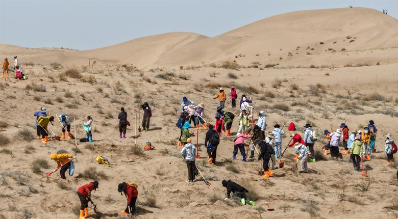4月21日,志愿者在民勤县种林公益发展中心公益林基地种植区挖储水坑。新华社记者 郎兵兵 摄