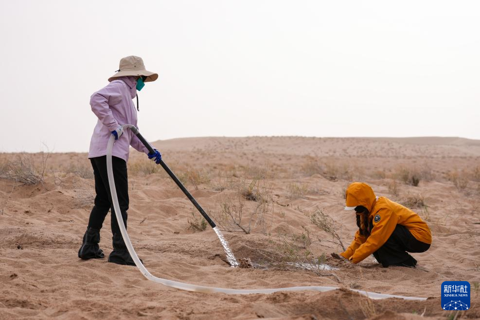 4月20日,在民勤县种林公益发展中心公益林基地种植区,志愿者为树苗浇水。新华社记者 郎兵兵 摄