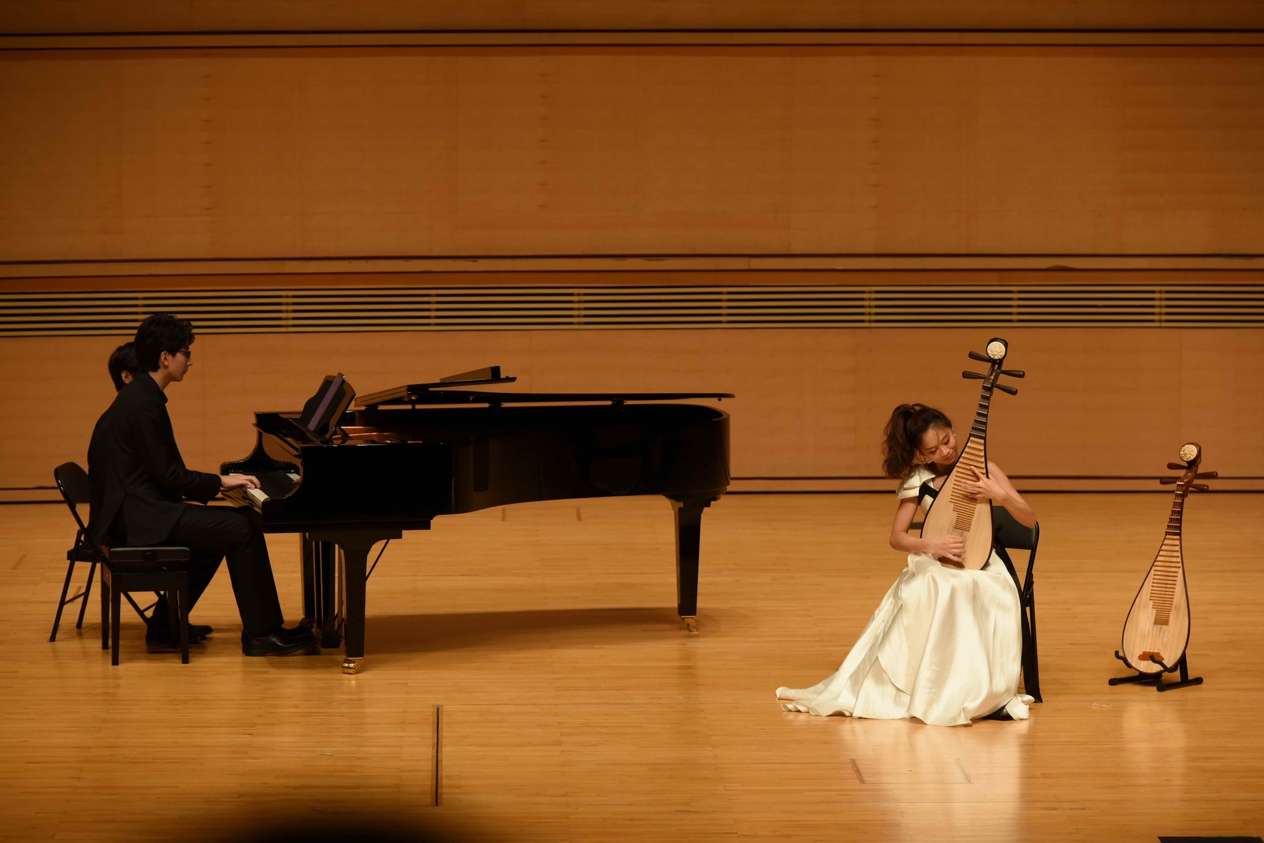 琵琶独奏曲《点》将点的概念以一种独特而富有感情的方式表现出来,将中国传统书法与本曲的艺术表现和演奏技法联系,恰巧对应了弹拨乐“点”状语言的特性。用琵琶的张力滑音、绰注等左手技法模拟秦腔“苦音”的韵腔,情绪和音区的落差具有戏剧性,张力饱满,给观众带来强烈而丰富的视听享受。最后,音乐会在琵琶与钢琴协奏曲《草原小姐妹》中落下帷幕。